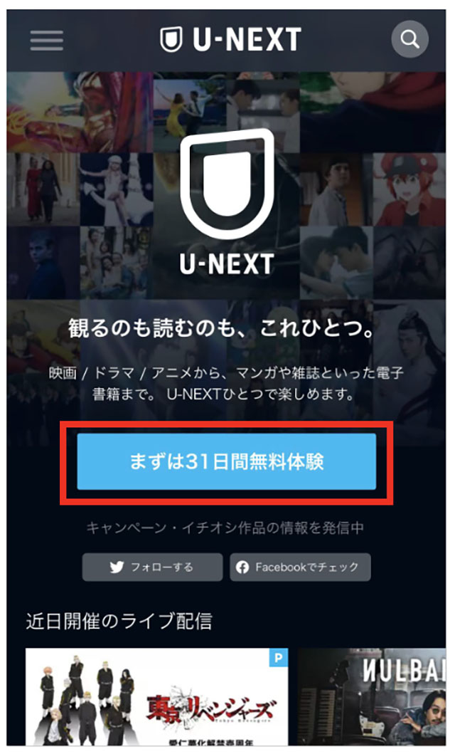 - U-NEXTにアクセスして、まずは31日間無料体験をタップ