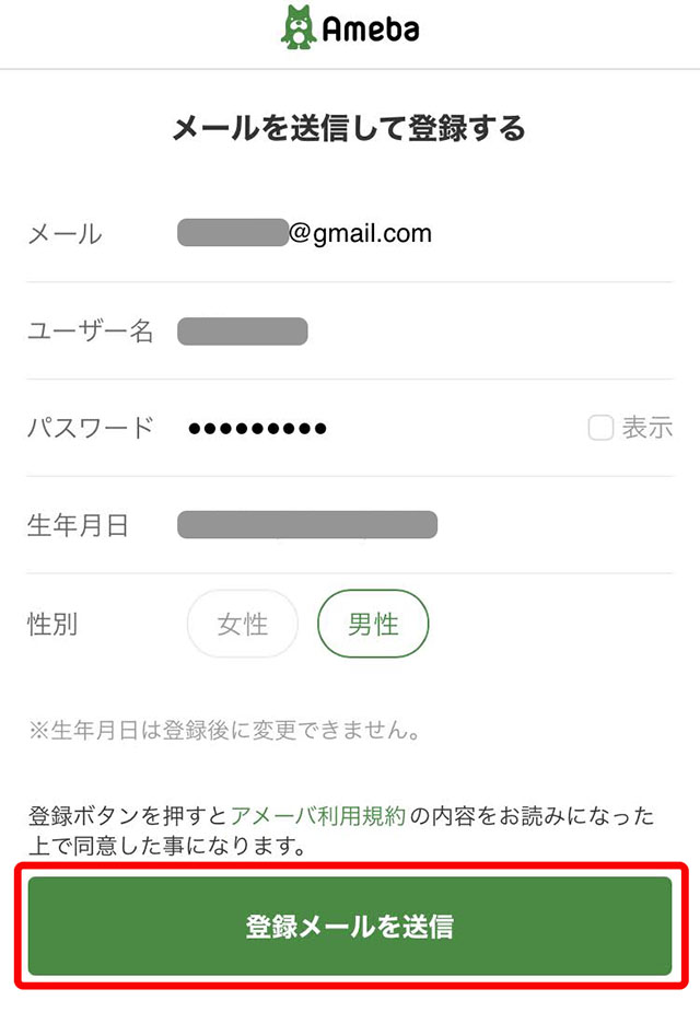 - 「メールアドレス」「ユーザー名」「パスワード」「生年月日」「性別」を入力して、「登録メールを送信」をタップ