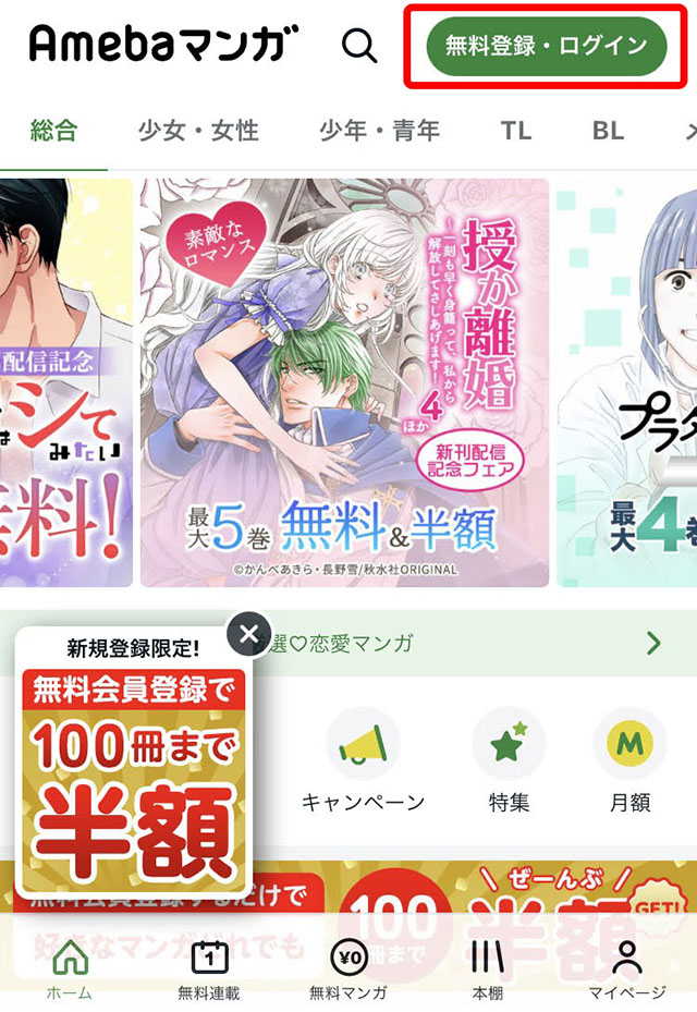 - 新規ユーザーを対象に、「無料会員登録で100冊まで半額クーポ