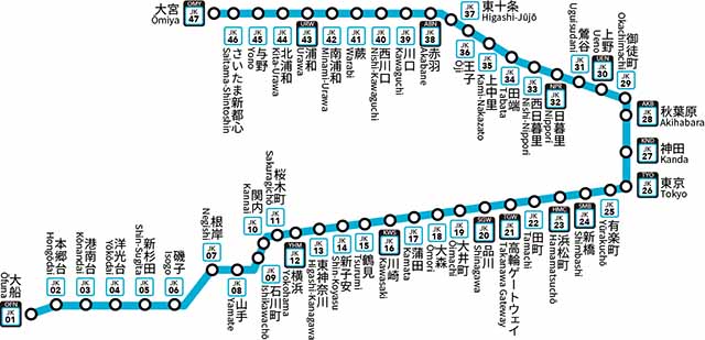 大宮駅 – 東京駅間は東北本線の一部、東京駅 – 横浜駅間は東海道本線の一部です。