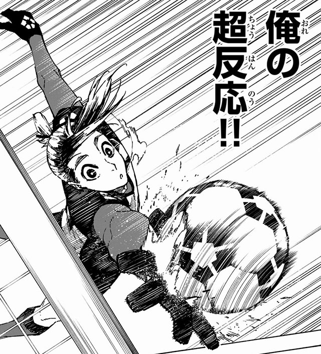 チームVとの試合の際、蜂楽のセンタリングに反応した我牙丸。