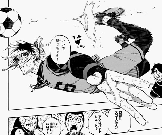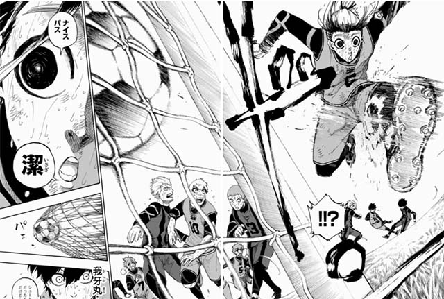 チームYとの試合、1対0と負けている状況下で、二子に弾かれた潔のシュートのこぼれ球を押し込んだ場面。