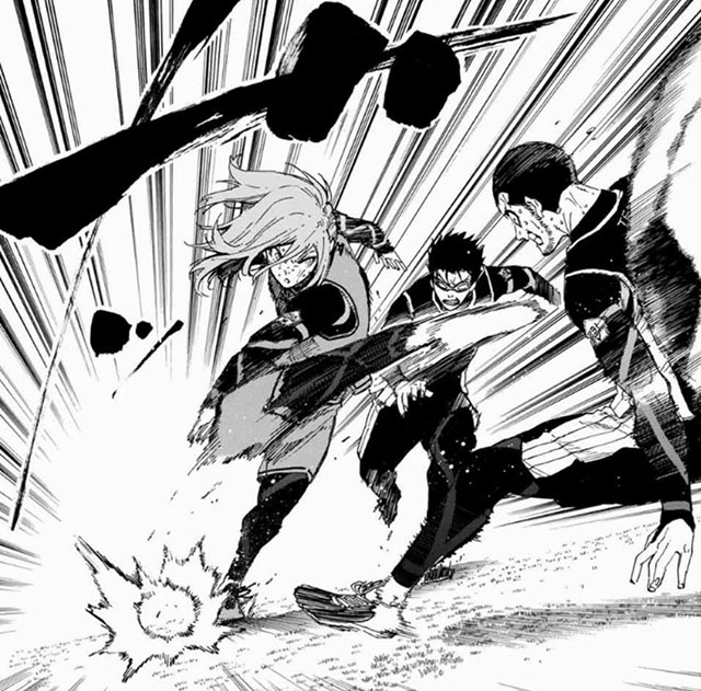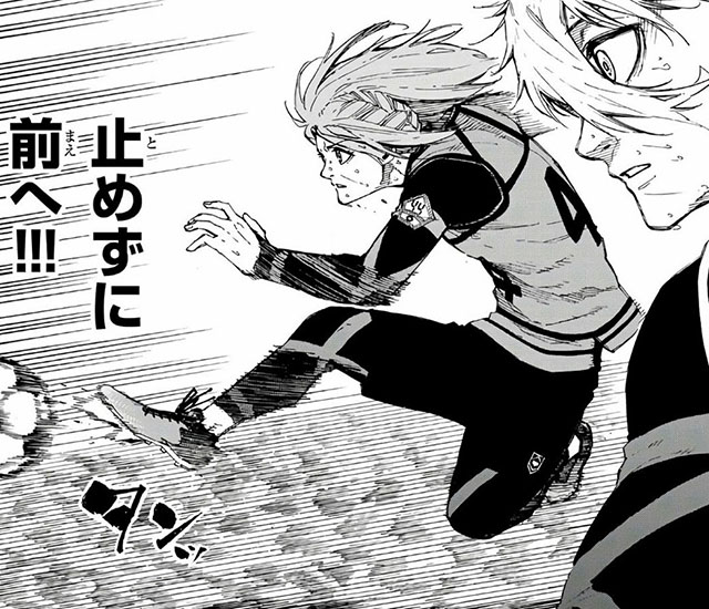 潔のパスを受けた千切は、自分で出したパスに自ら追いつき鰐間兄弟を突き放します。