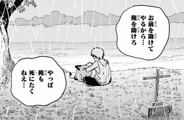 - デンジは、互いに生き残るためポチタ(チェンソーの悪魔)と契約