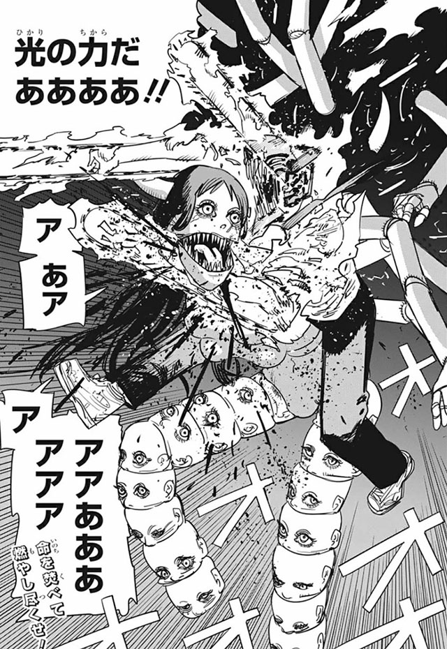 再度マキマに挑んだデンジは、過去の対戦では苦戦した武器人間ズ7体を撃破。