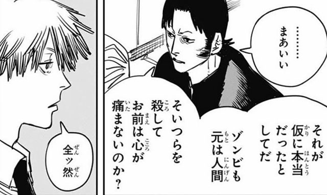 サムライソード戦で、「ゾンビも元は人間、そいつらを殺してお前は心が痛まないのか?」という問いに対し、「全ッ然」と答えたデンジ。