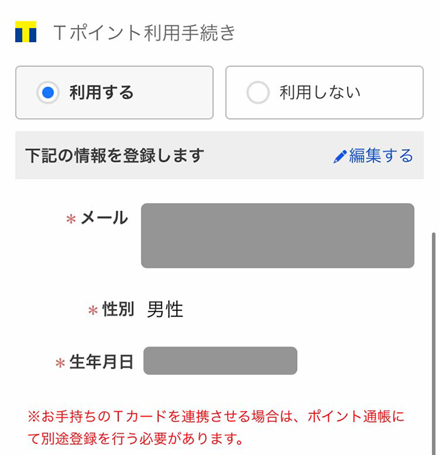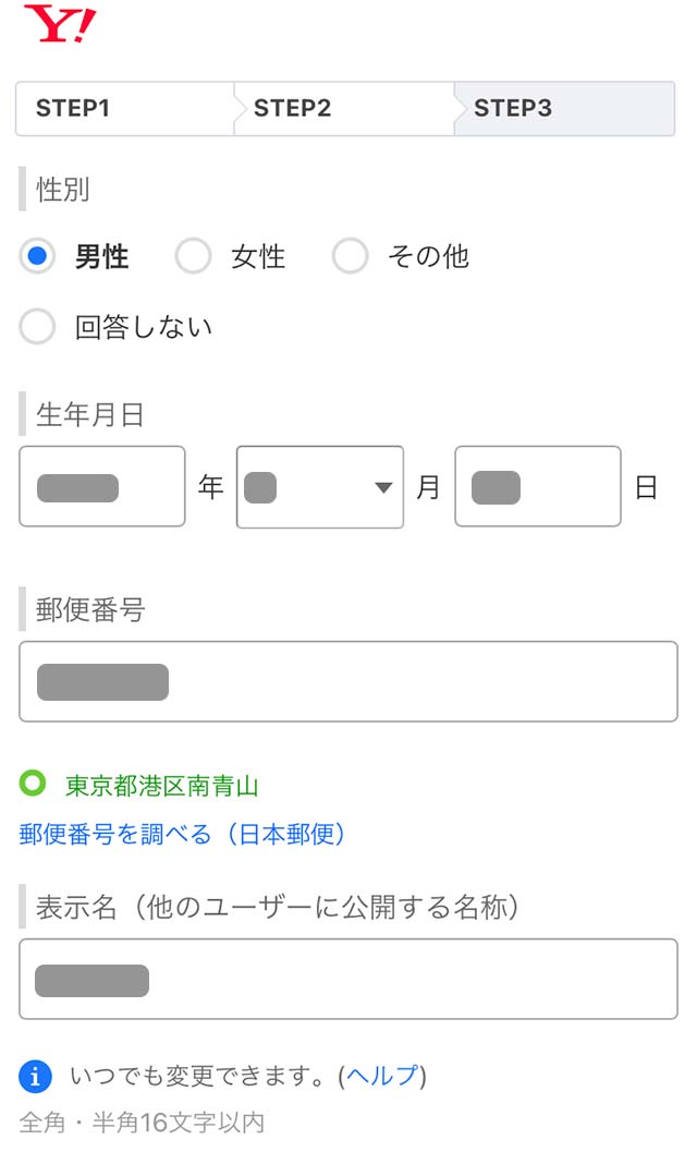 - 性別、生年月日、郵便番号、表示名、連絡用メールアドレスを入力して「登録する」をタップ