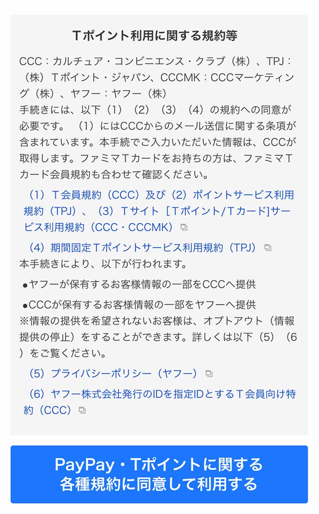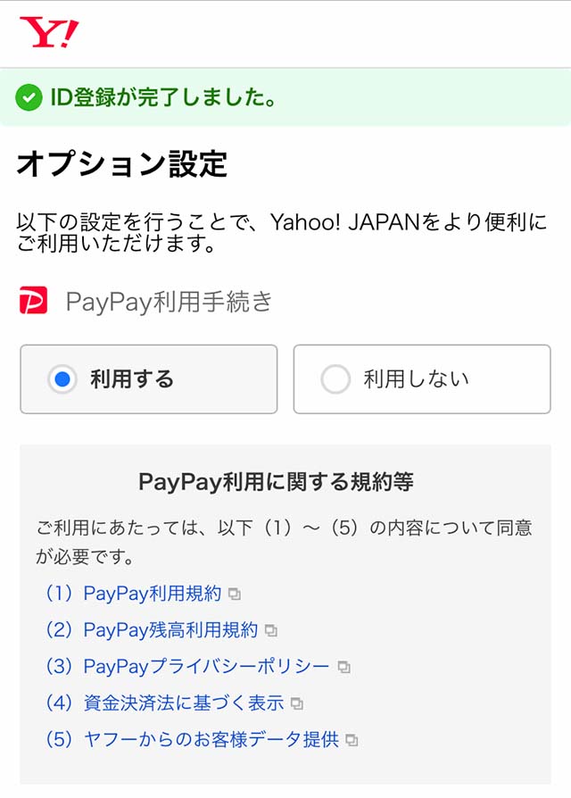 - ID登録が完了するので、オプション設定を選択し、登録内容を確認後「PayPay・Tポイントに関する各種規約に同意して利用する」をタップ