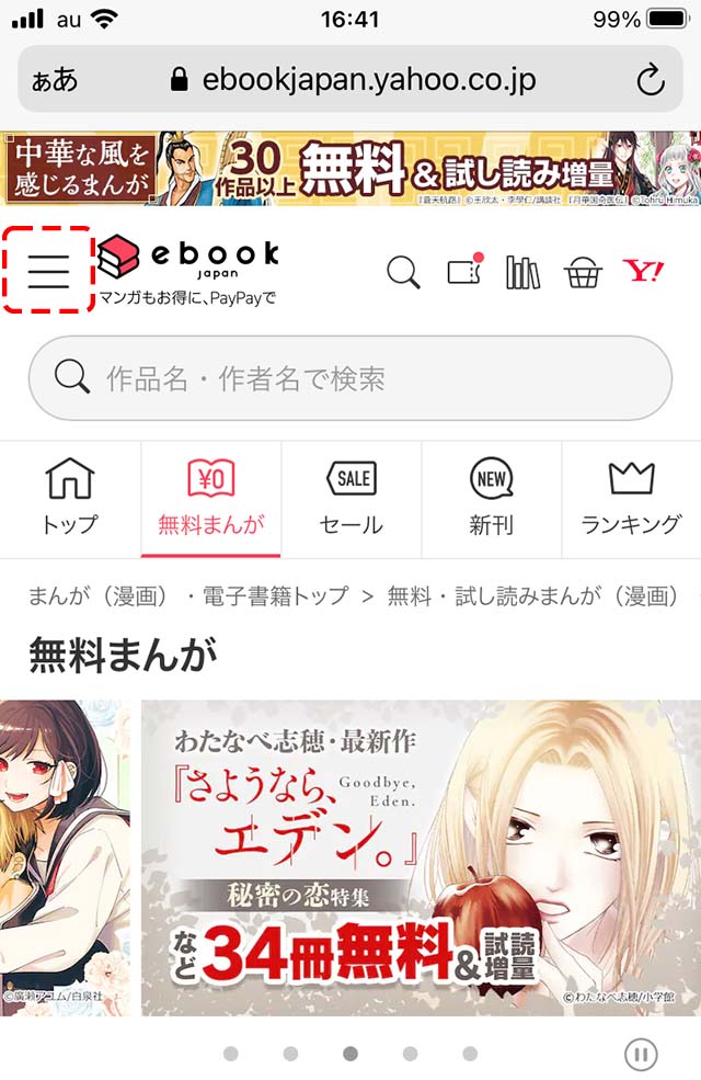 - ebookjapanのトップ画面にアクセスして、左上のメニューからYahoo! JAPAN IDでログイン。6回使える50%OFFクーポンが入手できます。