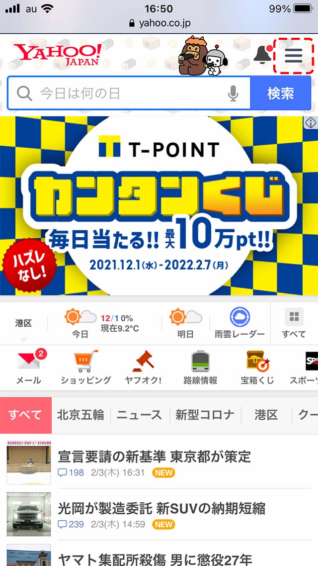 - Yahoo! JAPANのトップページにアクセスして右上のメニューから「Yahoo! JAPAN ID」をタップ