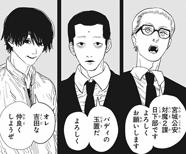 護衛自体はきっちりこなしていたものの、同時に招集された日下部、玉置と違い、デンジに「仲良くしようぜ」と気さくに挨拶していた。