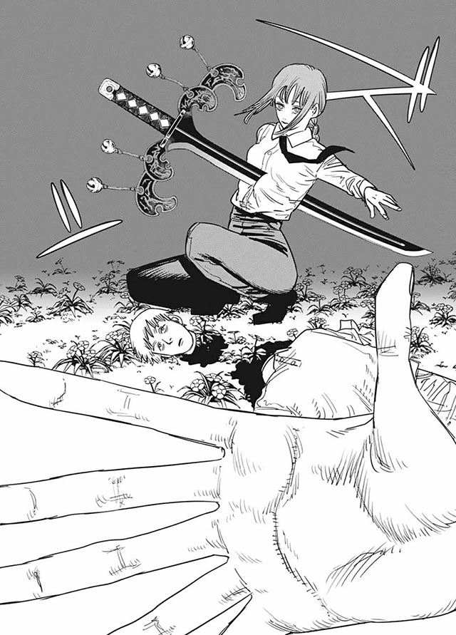 油断したマキマは、別れて潜伏していたデンジに隙を突かれてチェンソーで切りつけられます。