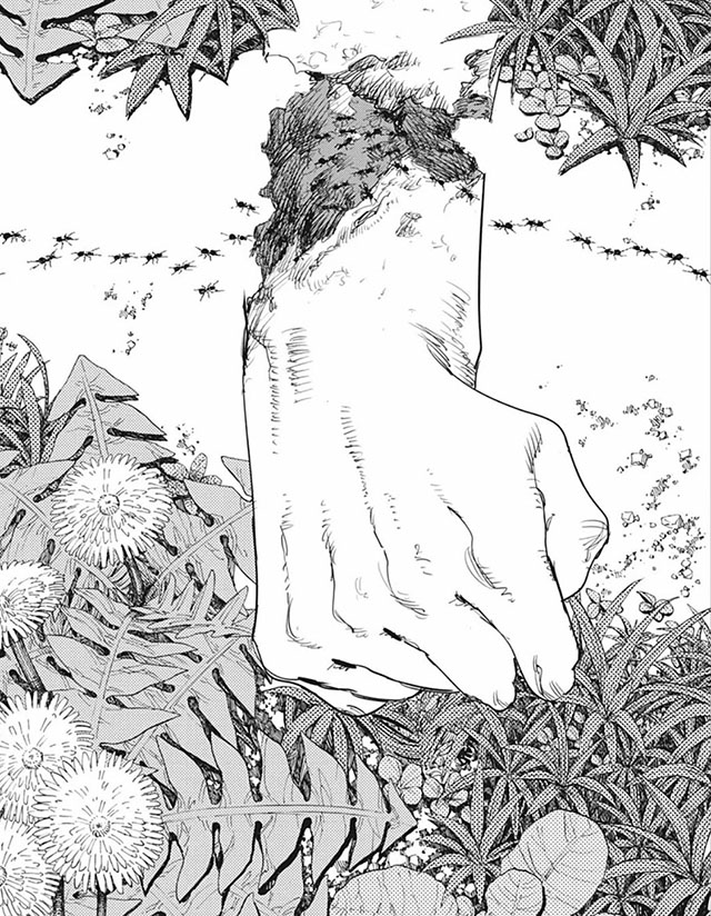 6本指を持つ巨人の手が空から現われ、地上のたんぽぽに拳をぶつけます。