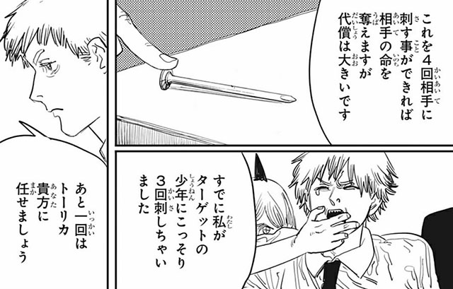 早川アキも呪いの悪魔と契約していますが、彼の場合は刀で3回刺して相手を倒します。