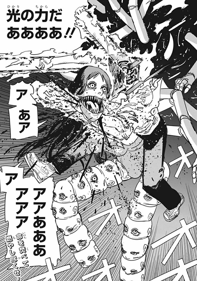 ですが、闇に対抗するのは光だと、火をまとったデンジのめちゃくちゃでしつこい攻撃でやられてしまいます。