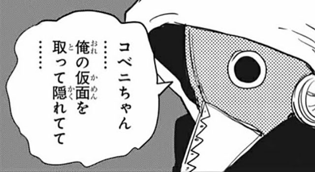 闇の悪魔との戦いで、腕を切り落とされた後、コベニにマスクを外して隠れろと指示します。