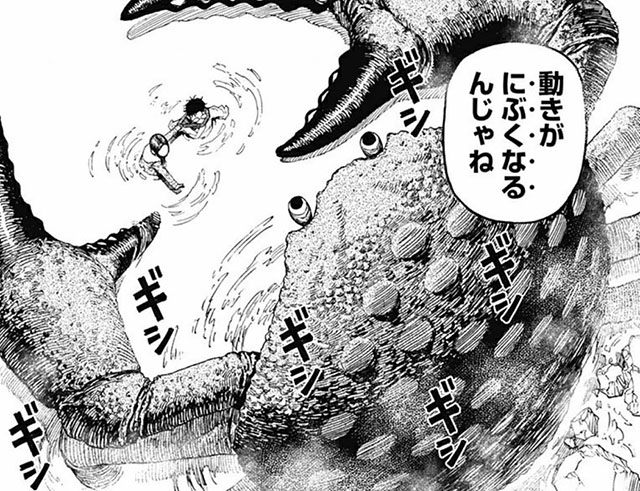 力士だけに、突っ張りのような技を使い、地面に手をつくと手が溶ける。