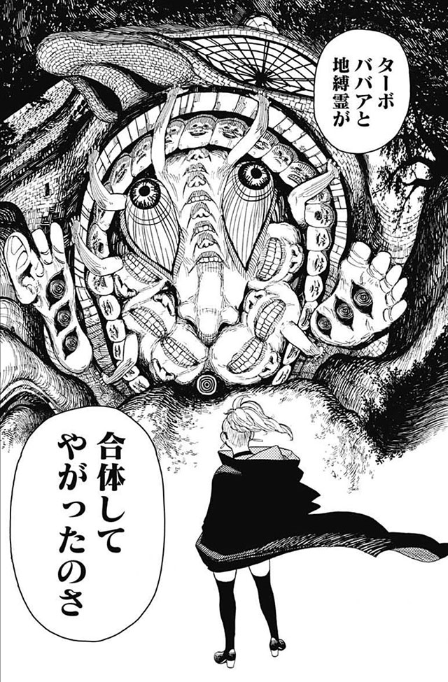 モモの挑発に乗って追いかけ回し、正能市から出て神越市に入ってしまうターボババア+地縛霊