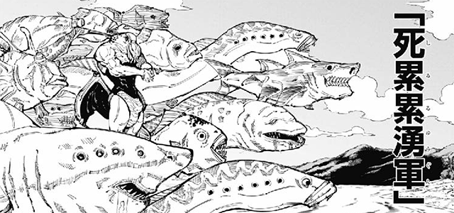 この領域では、「死累累湧軍(しるるゆうぐん)」という、どう猛な海洋生物型の式神を大量に召喚する必中の術式を発動できます。