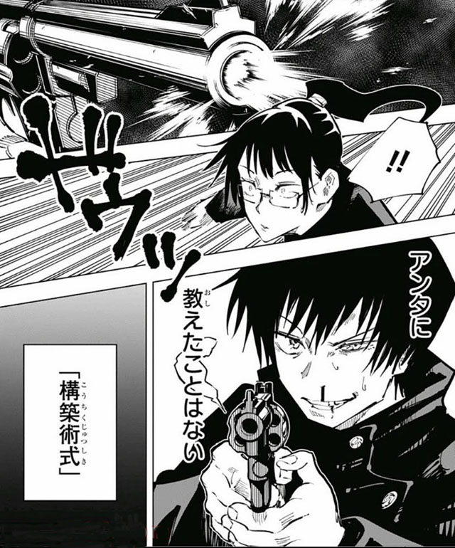 京都姉妹校交流会での真希との闘いでは、リボルバーの一般的な装弾数6発をブラフに使い構築術式で構築した銃弾を7発目として発射。