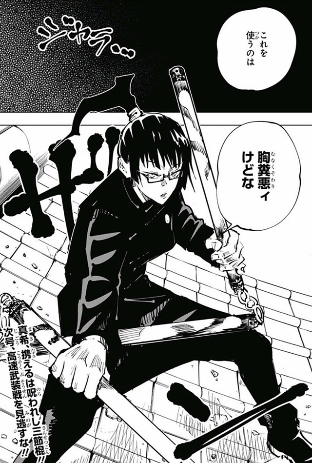 禪院真希は、第46話で特級呪霊花御と闘う際、伏黒恵三節棍を手渡されこう言いました。