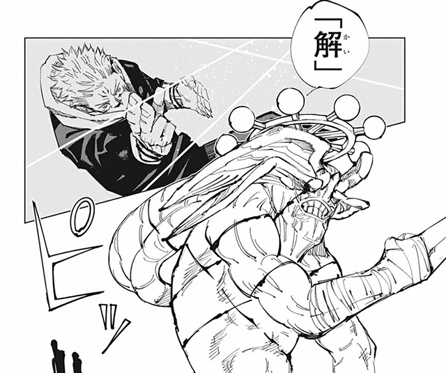領域展開後、必中効果範囲内の呪力を帯びたものに「捌」が、呪力の無いものには「解」が絶え間なく浴びせられます。