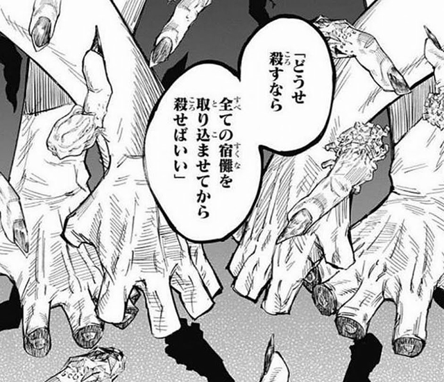 2018年7月西東京市英集少年院での特級呪霊と交戦した際、肉体の主導権を握っている間は、心臓を抜き取っても生き続けることができる宿儺は、虎杖の心臓を人質にとることで、体を手に入れます。