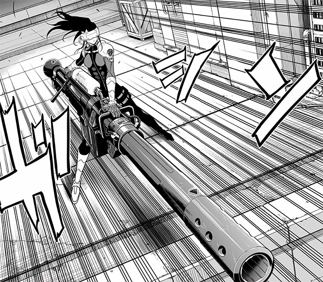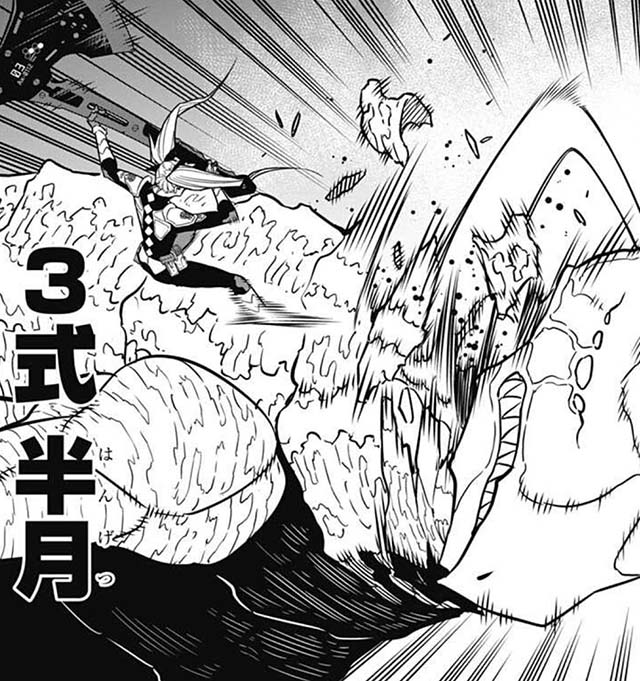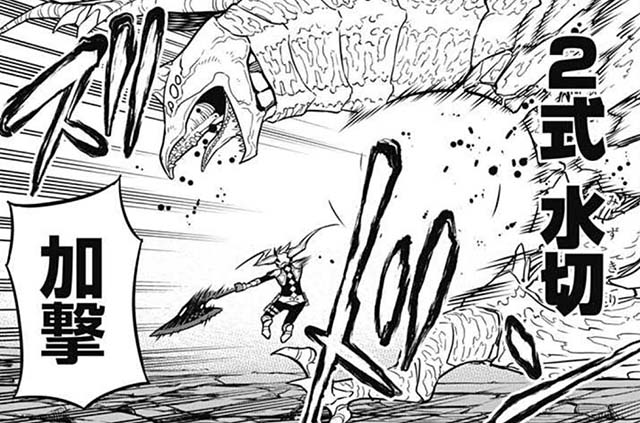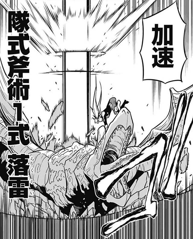 怪獣8号第26話より引用 - 隊式斧術2式水切:トリガーで通電し、衝突時前方に衝撃波を発生させることにより加撃する
