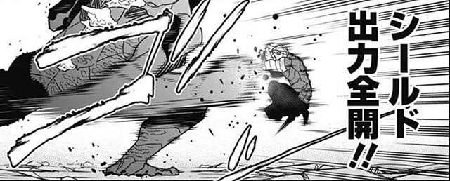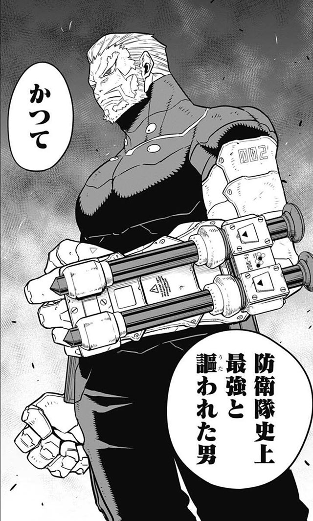 怪獣2号をベースにしたスーツは、シールド出力全開の状態では、怪獣8号の全力パンチにも対応します。