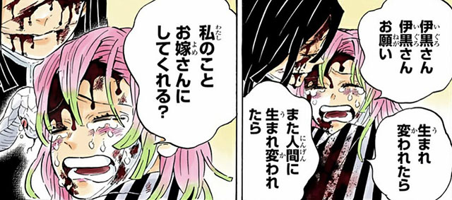 無惨との戦いが終わり、伊黒甘露寺も深手を負っていて、命の灯が消えかけていました。