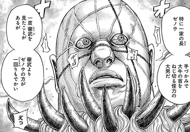 一家全員が武闘派だが、中でもゼノウは、蒙武よりも一回りは大きい体躯で、牛の首を片手でねじ切る怪力の持ち主。