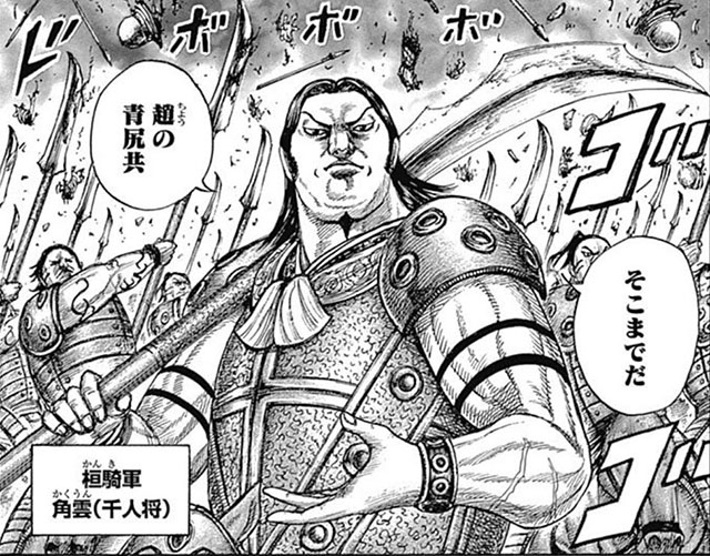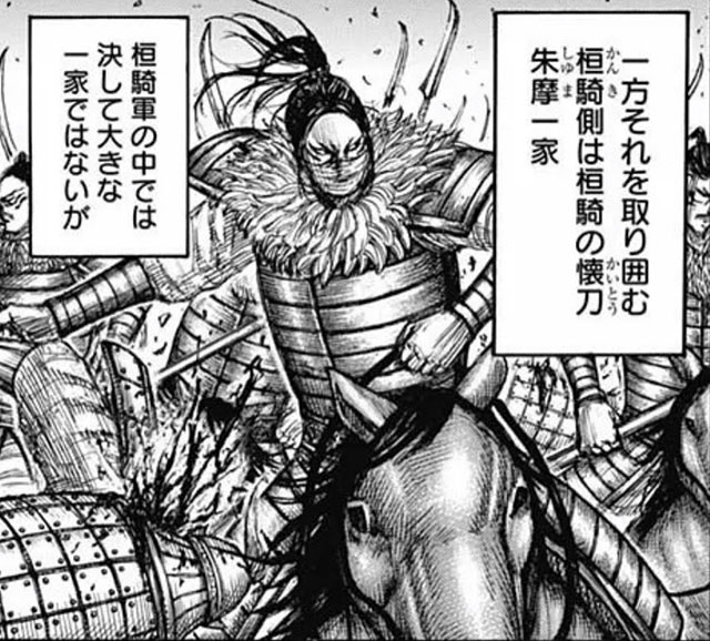 得物は矛で、「鉄壁」と呼ばれるほど守戦に長けているが、黒羊編では奇襲してきた趙将軍・紀彗に首を刎ねられ戦死。