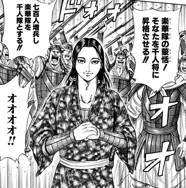 信が馬陽の戦いの活躍を経て三百人将に昇格した後、同年代の特殊三百人隊・楽華隊の隊長として信と出会う。