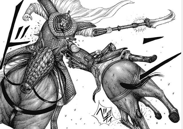 王賁は決死の一突きで尭雲の右腕を粉砕するが、そのまま振り下ろされた尭雲の刃が届き、落馬してしまう。