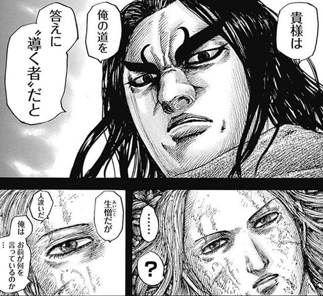 とある戦で大敗し、ボロボロになりながら一人で深山をさまい歩き、命が尽きようとした時、”求道者(ぐどうしゃ)”龐煖と出会う。