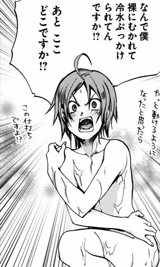 村の牢屋で、別の理由で投獄されたギースと共に監禁されていたルーデウスですが、全裸に剥かれ、冷水を浴びせられ、獣族のお姉さんに言葉責めも受けました。
