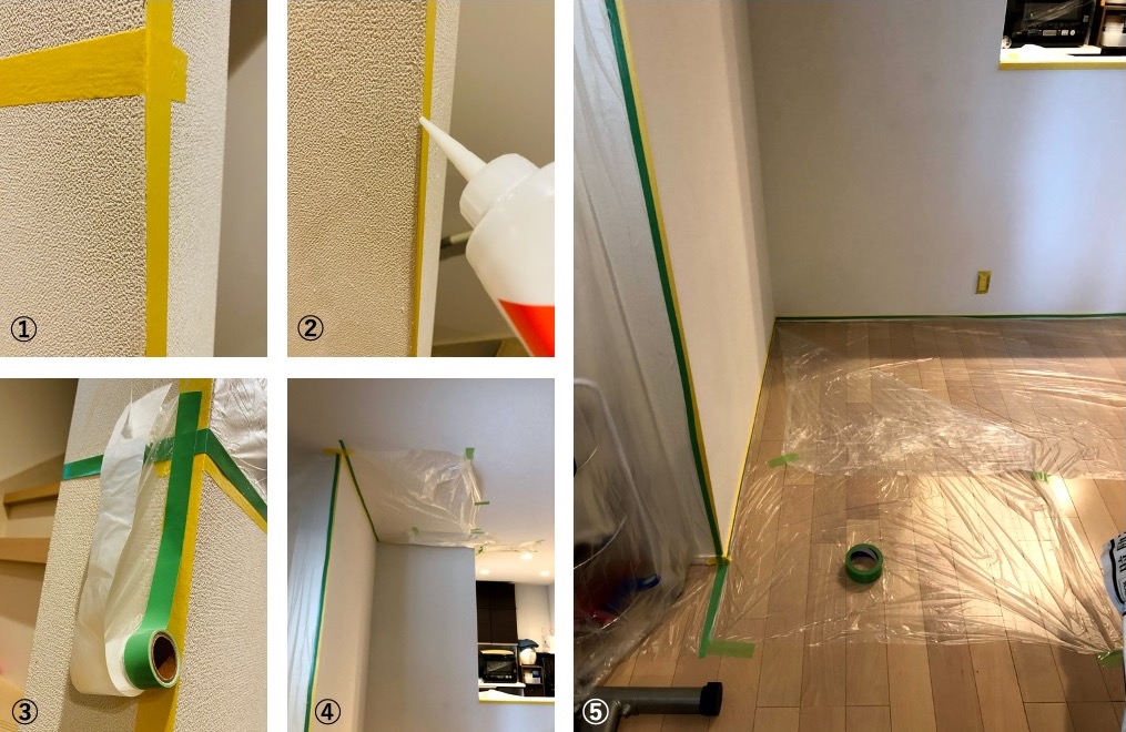 - マスカーのフィルムを伸ばして、養生テープで固定する