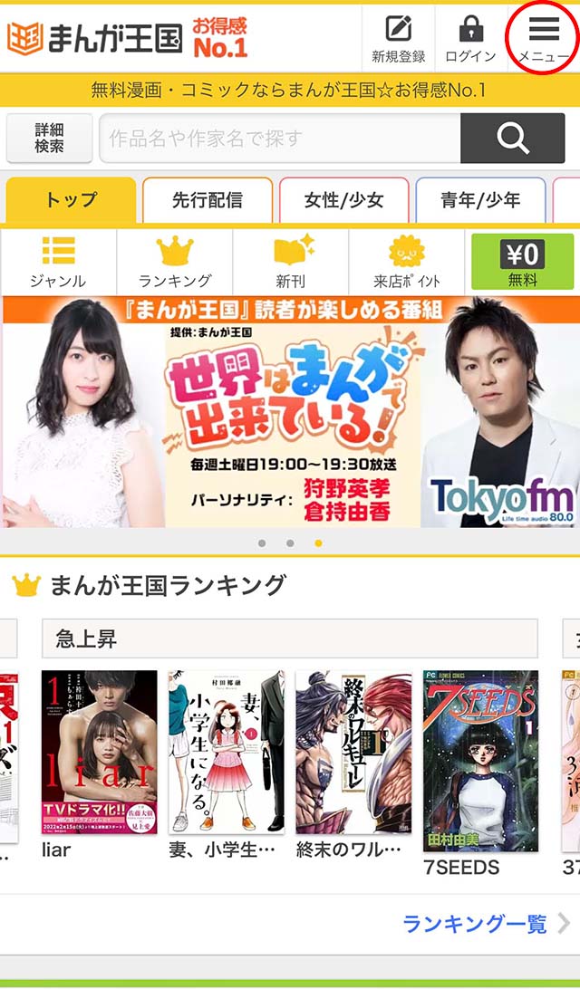 - まんが王国の公式サイトにアクセスして、右上の「メニュー」をタップ