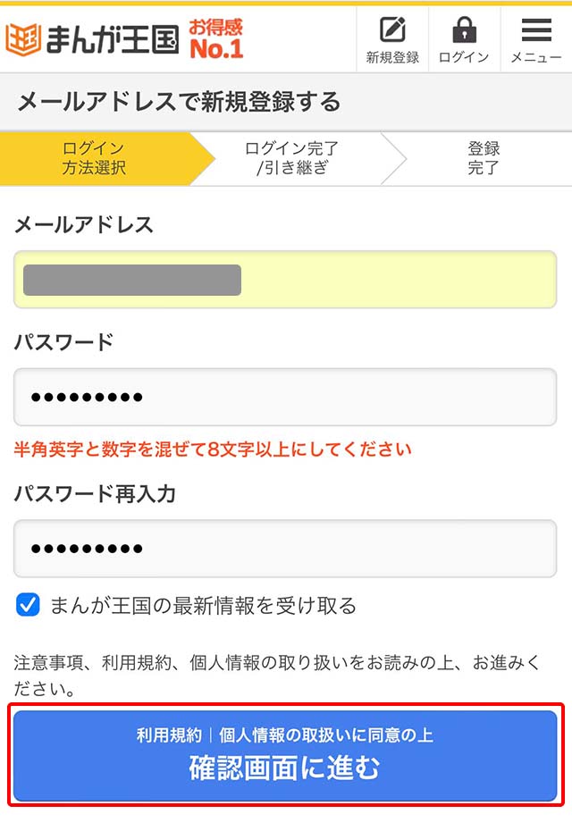 - メールアドレス、パスワードを入力して「確認画面に進む」をタップ