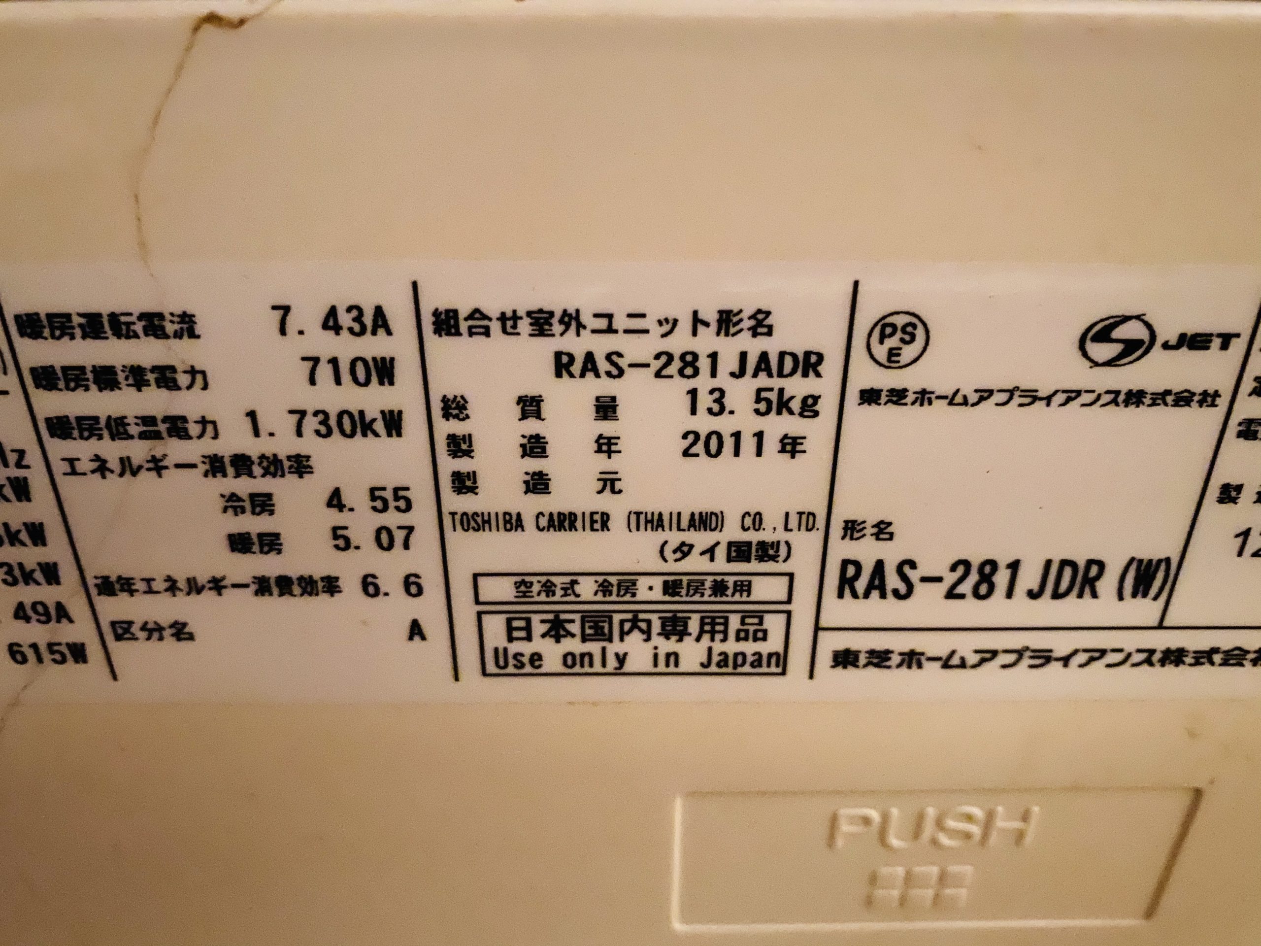 今回はすぐにエアコンの製造年を確認しましたよ。
