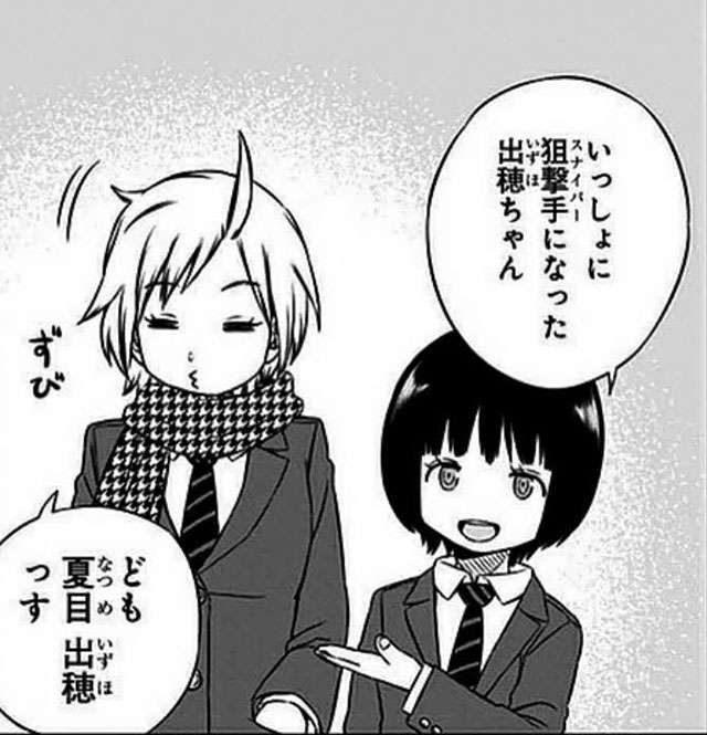 • 夏目出穂は、本部所属のC級隊員で、スナイパーとして訓練中