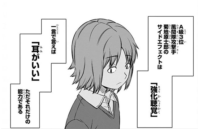 風間隊は、この菊地原の聴力を感覚共有することで、攻撃の回避などに役立てている。