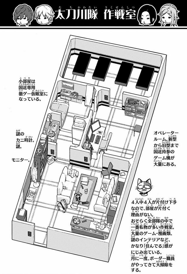 片付け下手の集まりである太刀川隊の作戦室は、多くの物が散乱し、生活感で溢れかえっている。